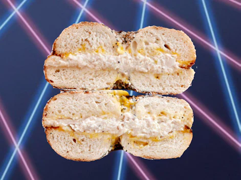 Local Bacon, Bodega-Style Eggs, American & Cheddar Cheeses, Spicy Honey, on an Everything bagel.