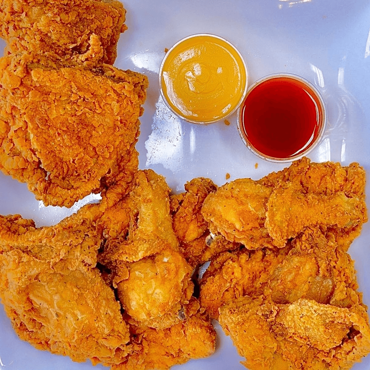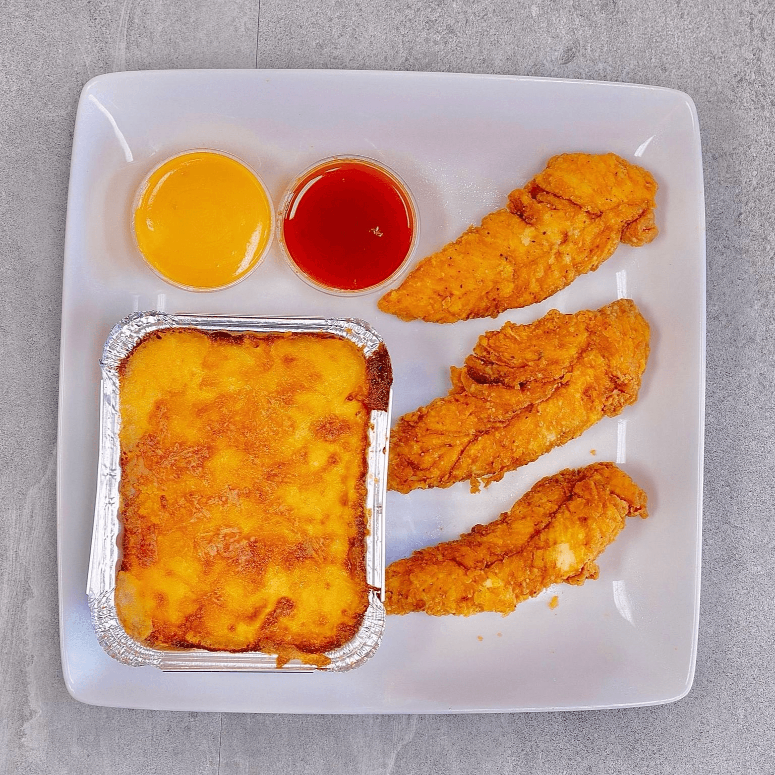 Comes with 1 waffle, 1 tender, 1 bacon, sausage, potato tots, 2 eggs