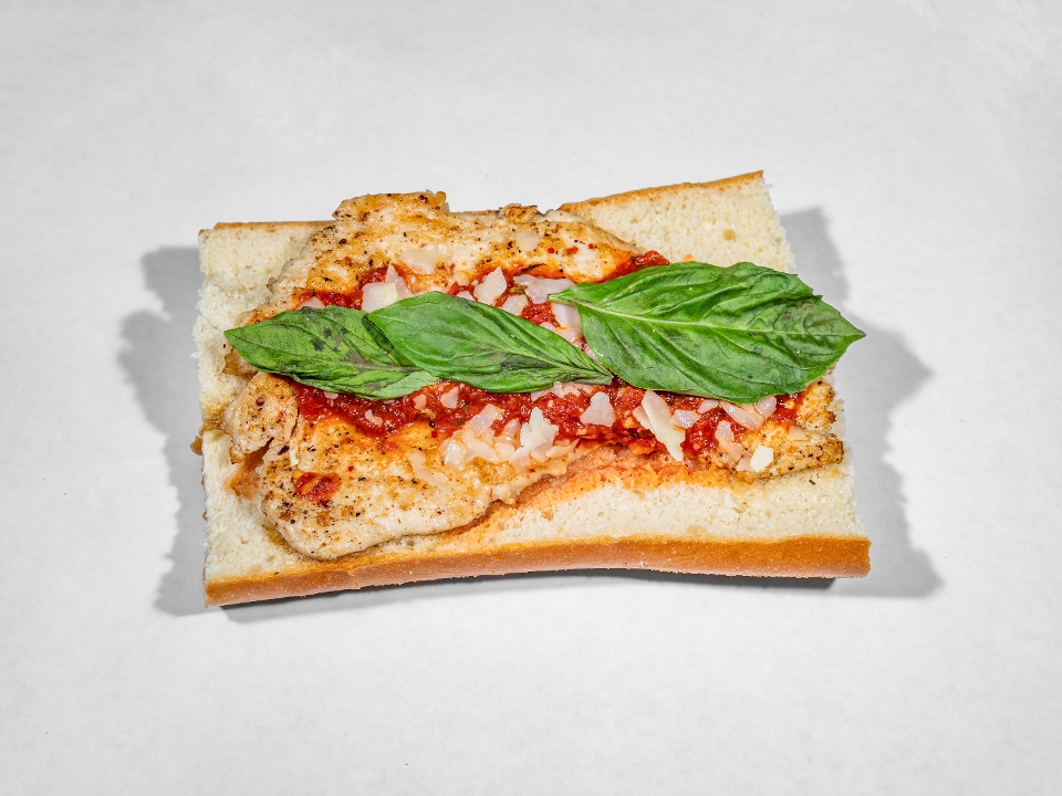 Warm hoagie roll, vegan meatballs, warm marinara sauce, shredded provolone (opt.), basil