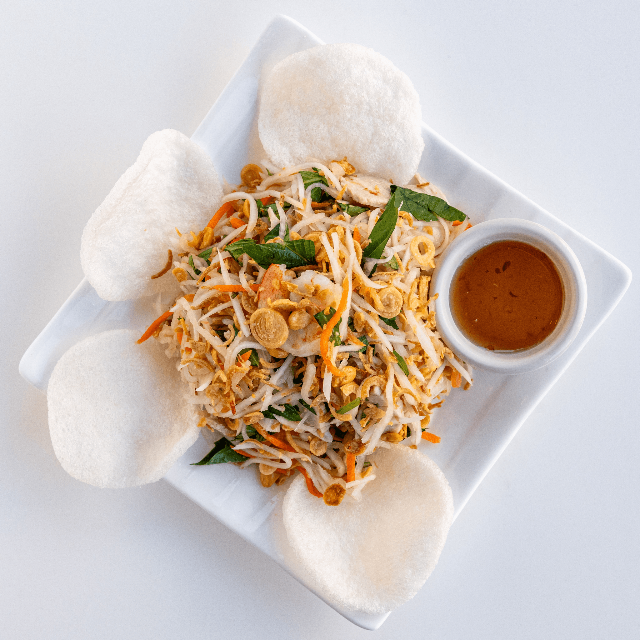 Four skewers of grilled beef and chicken, two grilled shrimps, and one fried egg roll cut to serve. Topped with peanuts, green onions, and fried onions. Served with our delicious homemade fish sauce.