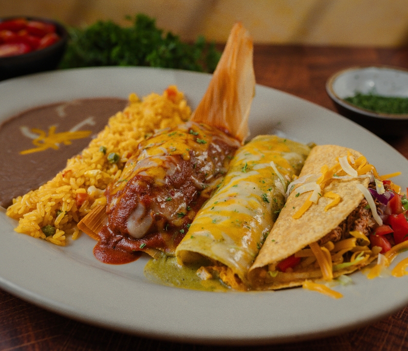 Choose 3 of the following items to make your own combination. Served with Mexican rice, refried beans, guacamole, pico de gallo, and sour cream.