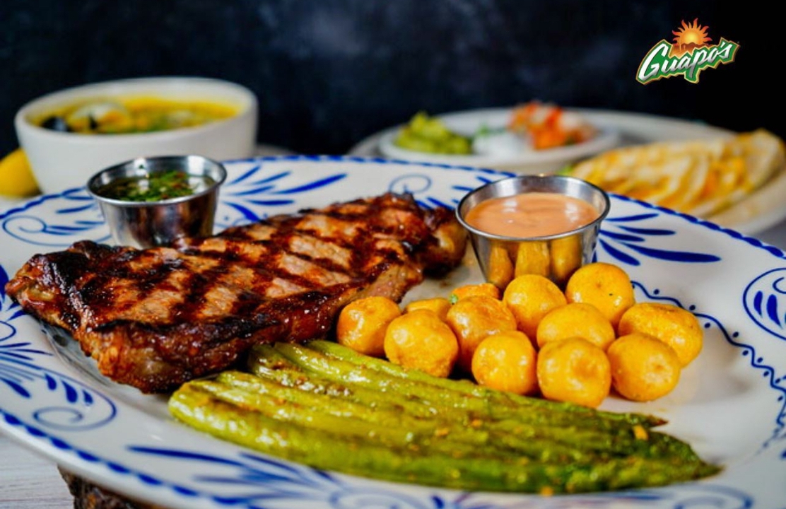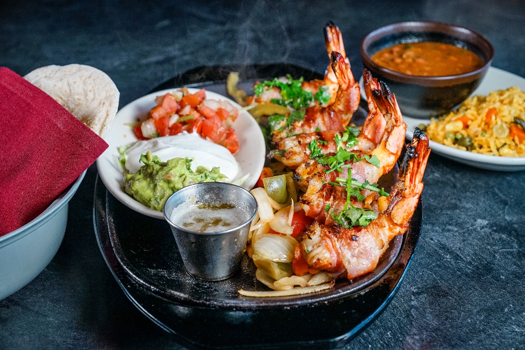 Grilled Chicken, Steak, Camarones Diablo, Baby Back Ribs and Quail. Served over sautéed green peppers, celery and Spanish onions. Served with Mexican rice, a la charra beans, lettuce, guacamole, pico de gallo, sour cream and homemade flour tortillas on the side.