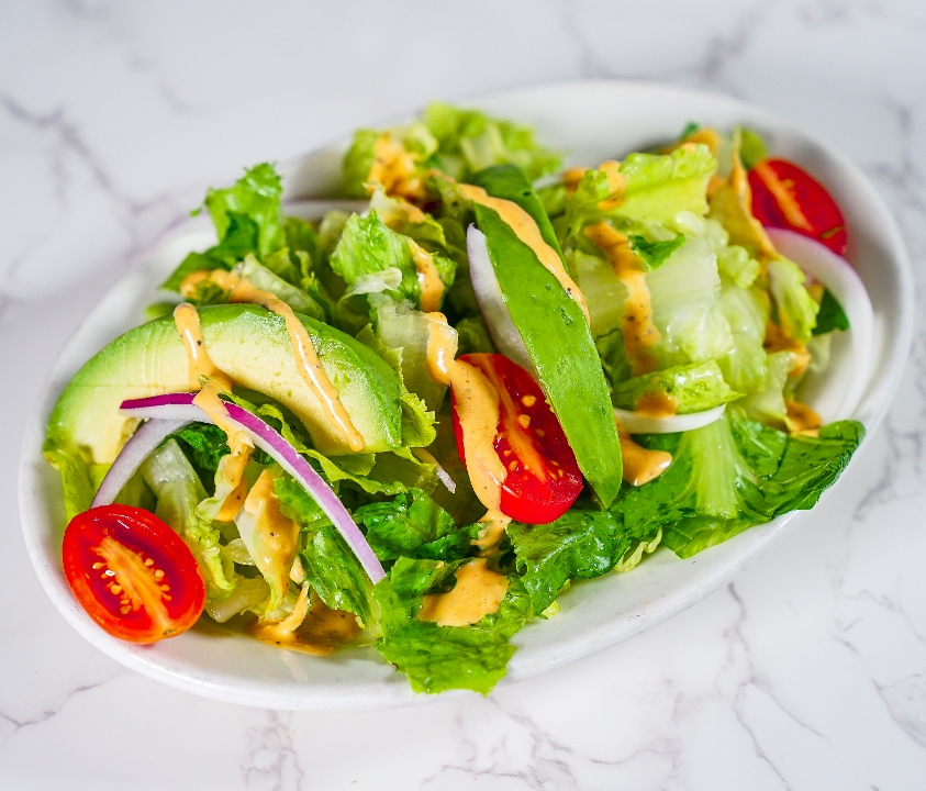 Romaine lettuce, avocado, tomatoes and red onions. Served with our house dressing on the side.