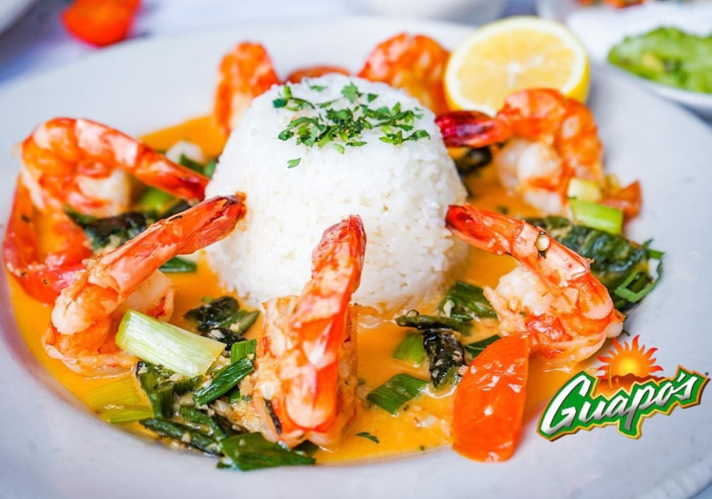 Shrimp sautéed with white wine, Spanish onion, garlic and crushed peppers. Served with white rice and black beans.