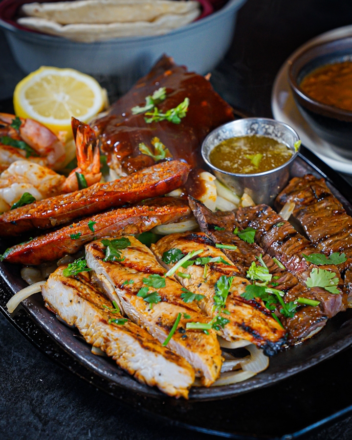 Grilled Steak, Chicken, Baby Back Ribs, Camarones Brochette, and chorizo. Served with Mexican Rice, a la Charra Beans, Lettuce, Mexican Butter, Guacamole, Pico de Gallo, Sour cream and Homemade Flour Tortillas on the side. For Three people.