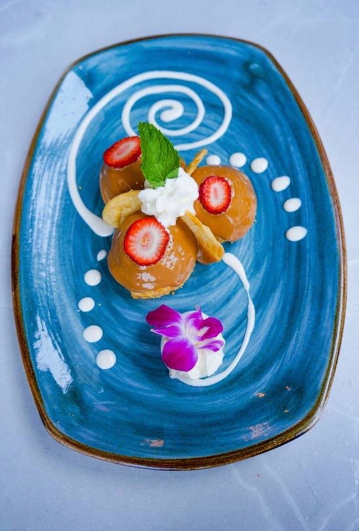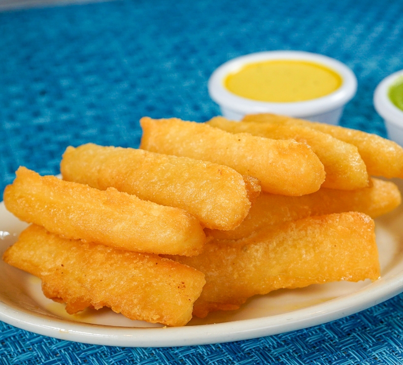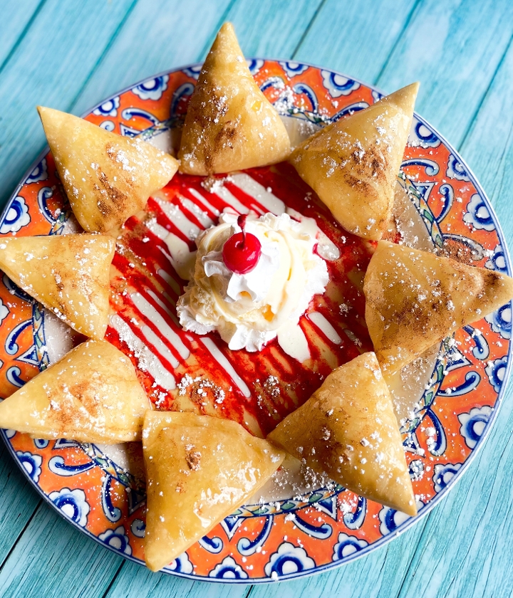 Home made Fried and crispy, golden on the out side soft on the inside. Coated with cinnamon sugar, warm flavor. Chocolate and arequipe for dipping