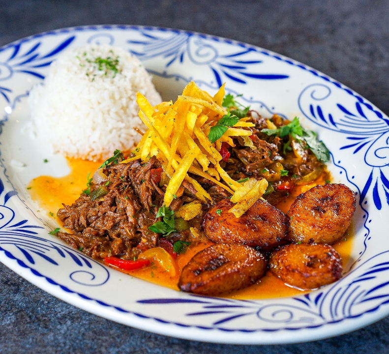 Shredded beef sauteed with green peppers, onion, cilantro. Served with white rice topped with fried plantain, black beans on the side.