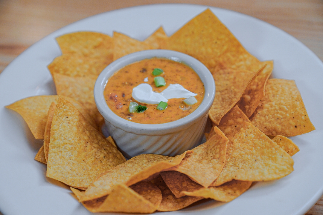 Chile con queso with seasoned ground beef and charra beans, topped with chopped onions, cheese and sour cream.