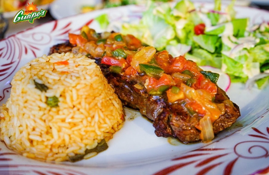 Grilled New York strip steak topped with diced sautéed Spanish onions, green peppers and tomatoes. Served with Mexican rice, refried beans and salad.