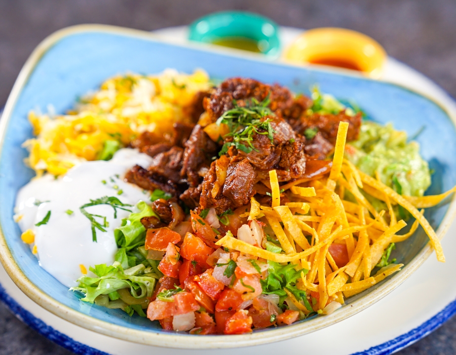 Just like a burrito, but served in a bowl with no tortilla, with white rice, black beans, lettuce, guacamole, pico de gallo, sour cream, shredded cheese and crispy tortilla strips.