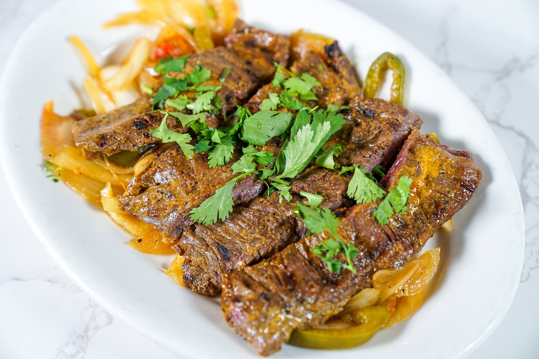 Strips of grilled steak sautéed with tomatoes, onions, celery, green peppers, jalapeños, French fries, and cilantro. Served with white rice on the side.