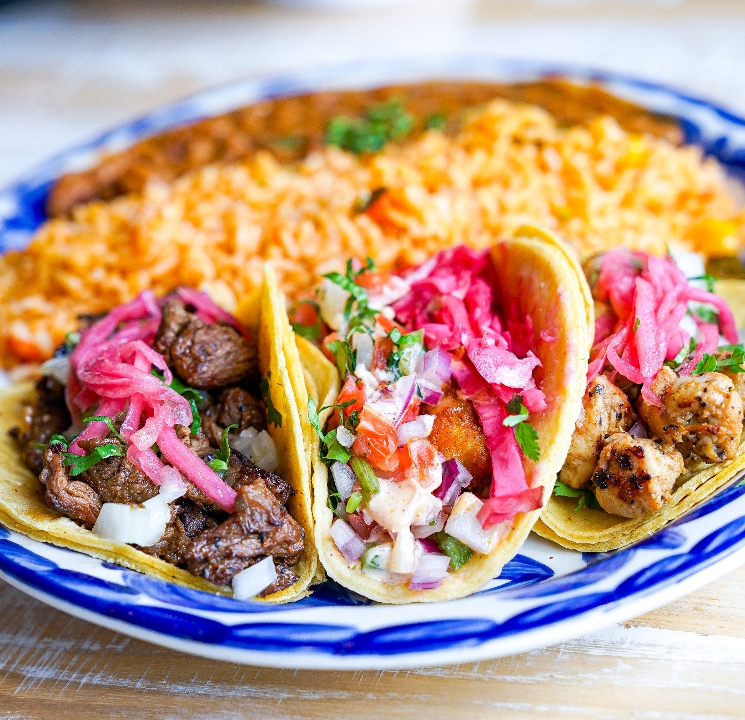 Three (3) tacos with Mexican Rice & Refried Beans on the side.