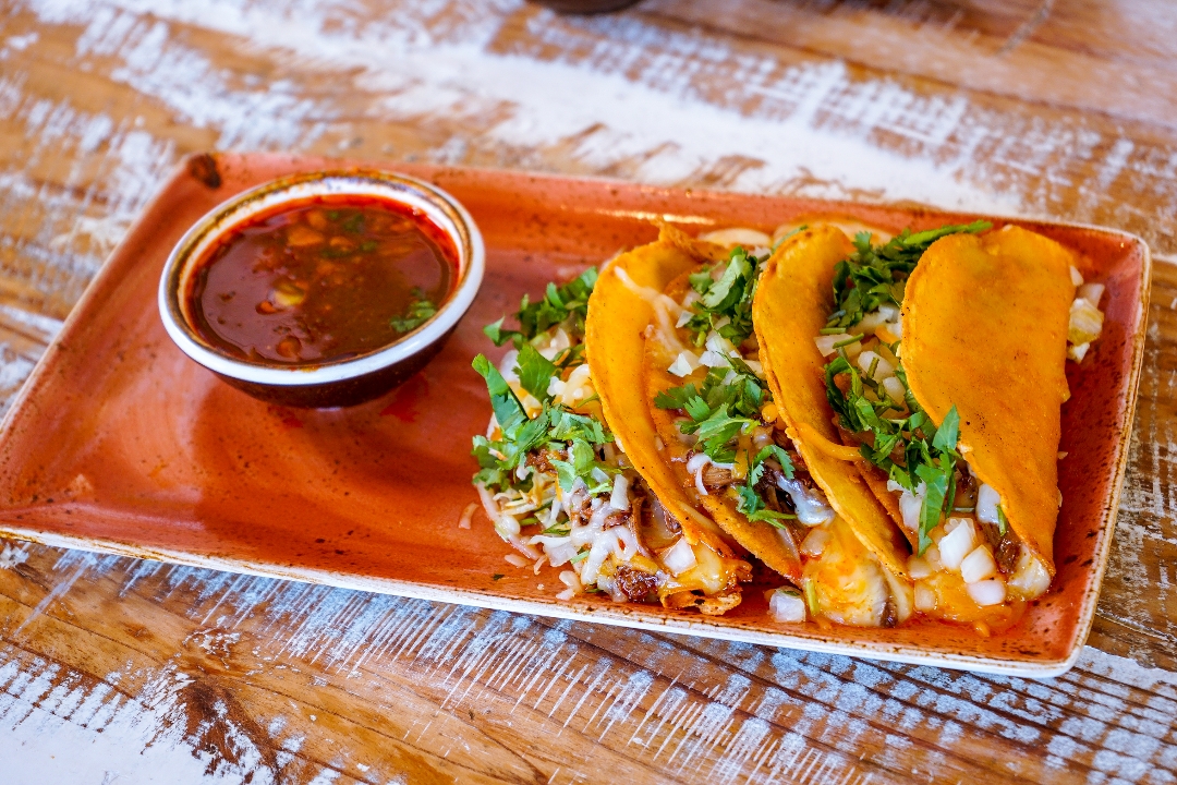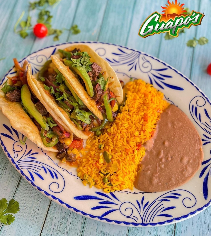 Three (3) Tacos braised beef in guajillo sauce, Monterrey Jack cheese, fresh cilantro, and onions. Served with Mexican Rice, refried beans, and consome.