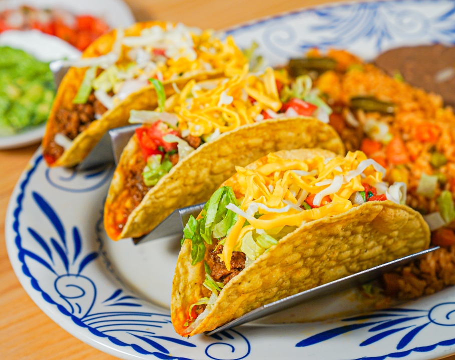 Three homemade crispy corn tacos topped with lettuce, shredded cheese and pico de gallo. Served with Mexican Rice, refried beans, Sour Cream and Guacamole on the side.