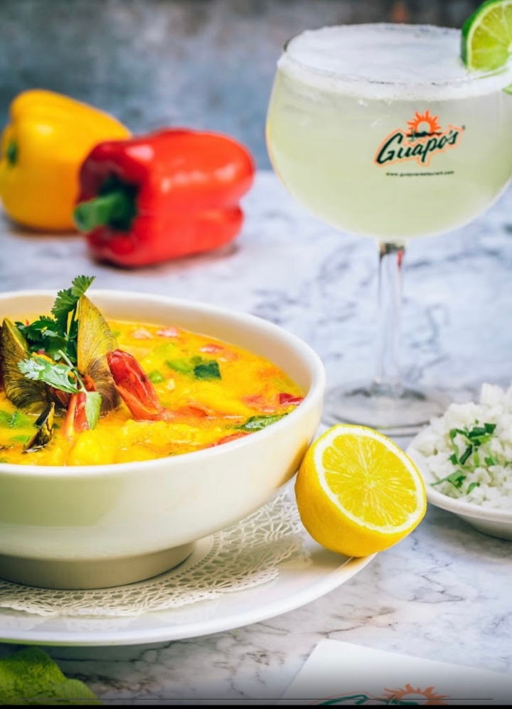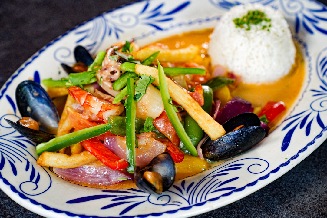 A generous portion of shrimp, scallops, squid, and mussels sautéed with tomatoes, onions, green peppers, jalapeño peppers, and potato fries. Served with white rice on the side.