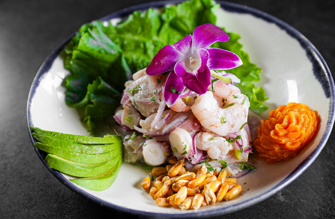 Marinated fish, octopus, and shrimp in a roccoto pepper sauce, cilantro and fresh lime juice mixed with Arequipa onions and cilantro.