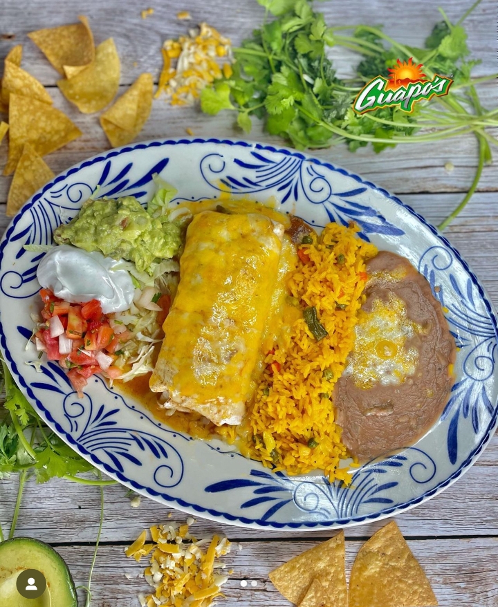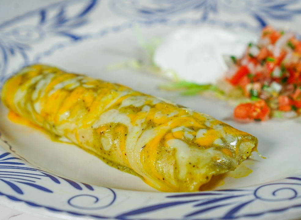 Large flour tortilla rolled with your preference and covered with melted Monterrey Jack and Cheddar cheese. Served with Mexican rice, refried beans, lettuce, guacamole, pico de gallo and sour cream.