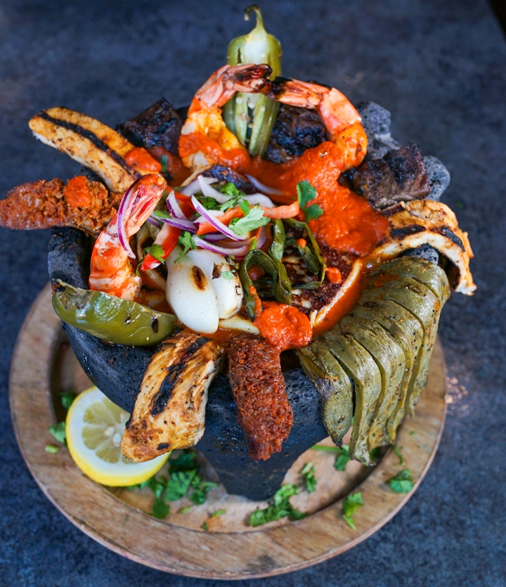 Shrimp, steak, chicken, chorizo, nopal, queso oaxaca, green onions, jalapeno with a touch of salsa brava. over a bed of sautéed green peppers, celery, tomatoes, and Spanish onions. Served with Mexican rice, a la charra beans, lettuce, guacamole, pico de gallo, Monterrey Jack cheese, sour cream and homemade flour tortillas on the side.