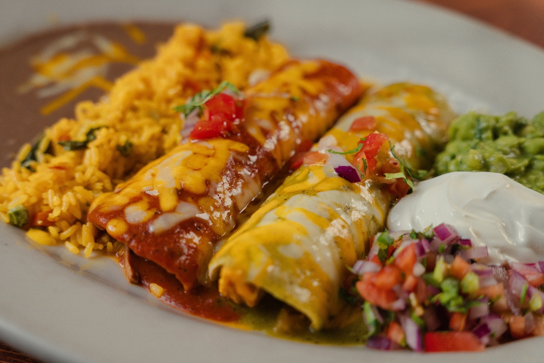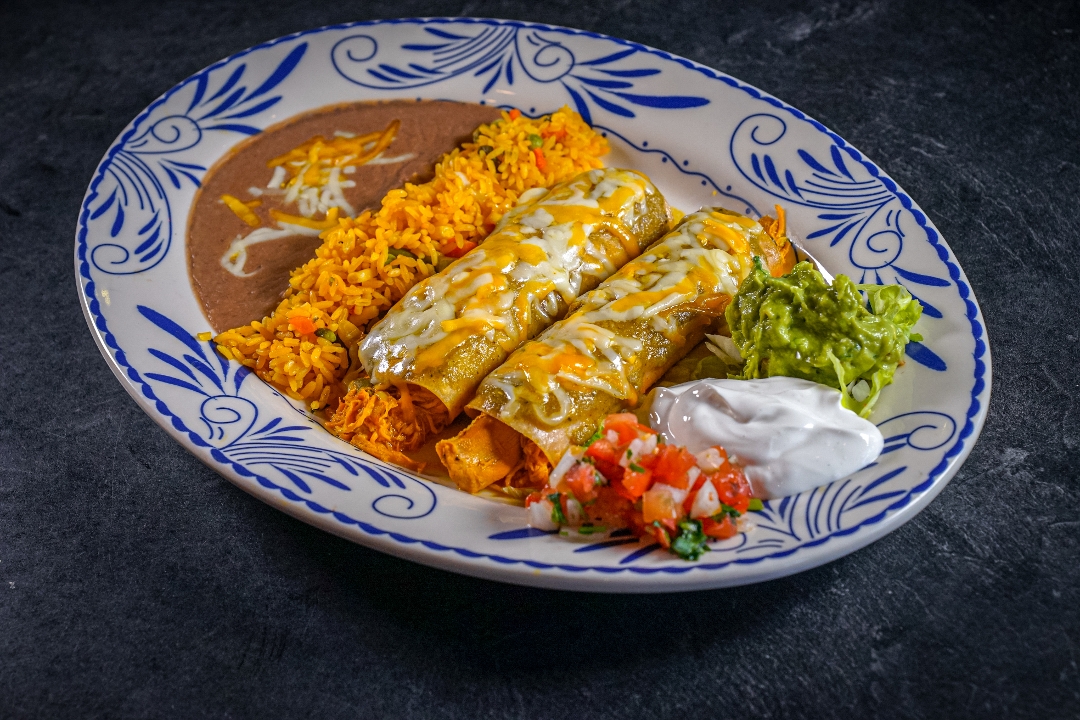 Two corn tortillas rolled with your preference and covered with melted Monterrey Jack and Cheddar cheese. Served with Mexican rice, refried beans, lettuce, guacamole, pico de gallo, and sour cream.