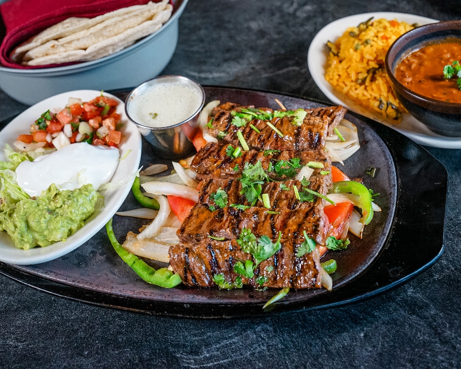 Three fresh flour tortillas filled with grilled Chicken or Steak Fajitas. Served with Mexican rice, refried beans, guacamole, pico de gallo, and sour cream.