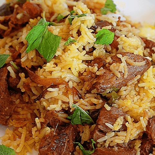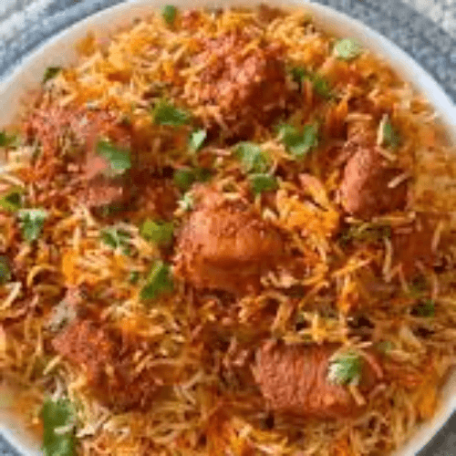 Boneless chicken marinated with spices, nuts, and herbs cooked with saffron basmati rice.