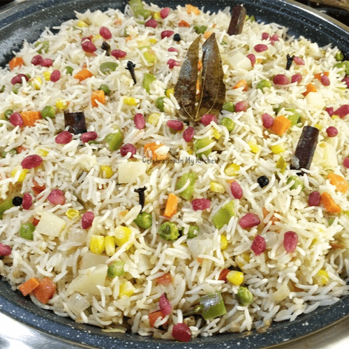 Saffron basmati rice cooked with fresh vegetables, herbs, and mild spices.