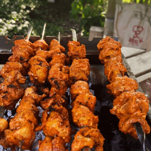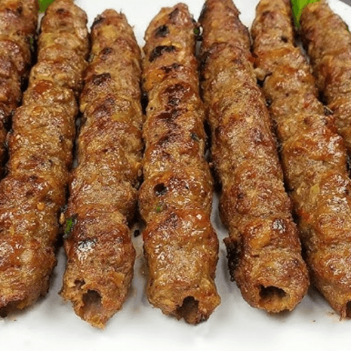 Minced beef marinated in herbs and spices, skewered over flaming charcoal in a clay oven.