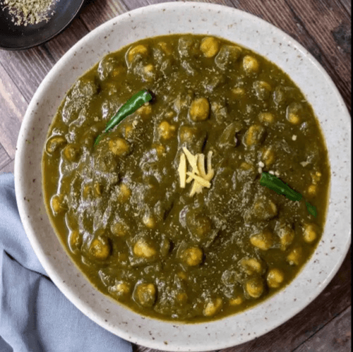 Spinach cooked with chickpeas, herbs, and mild spices.