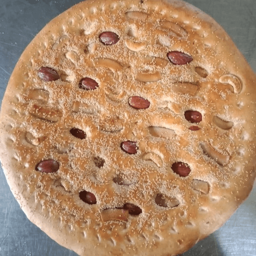 White flour bread layered with chopped onion baked in a flaming charcoal clay oven.