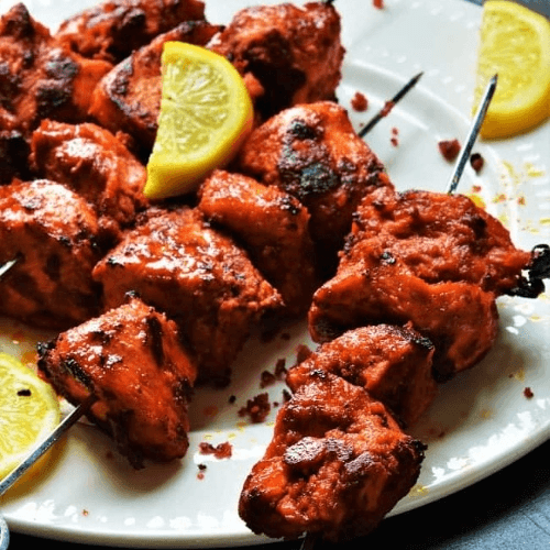 Chunks of boneless chicken breast marinated in yogurt and herbs, spiced with tomato, onion and bell peppers, cooked in a charcoal clay oven.
