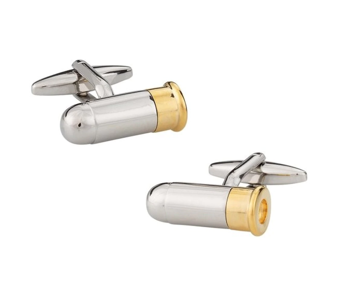 Pack some heat on your sleeve and show them that you mean business. Simple, to the point bullet cufflinks in a two-tone finish. By Cufflinks, Inc. Approximately 3/4"W x 1/4"H Silver and gold plated Bullet back closure